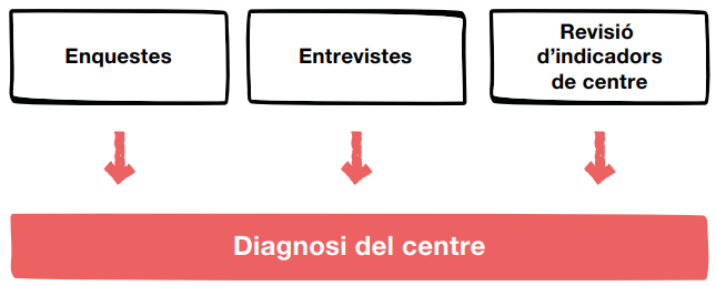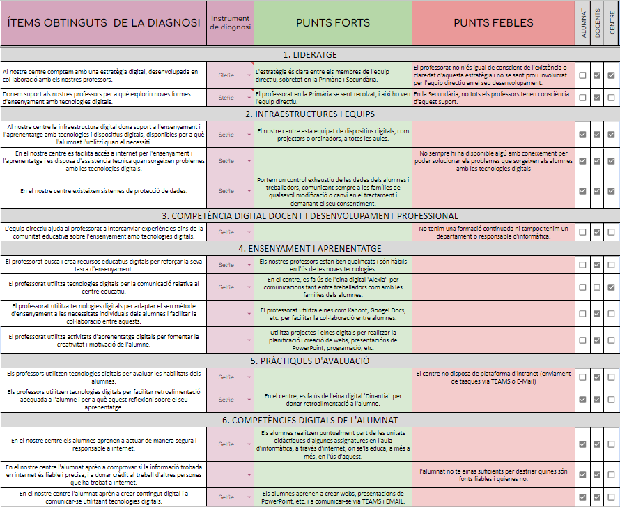 A partir d’indicadors que el centre ja té recollits o d’indicadors nous que hem creat, hem identificat les fortaleses i les debilitats del centre amb relació a l’assoliment de les competències digitals. Per fer-ho hem fet ús d’eines com enquestes i entrevistes per poder recollir tota la informació necessària per poder-ne fer una bona diagnosi.