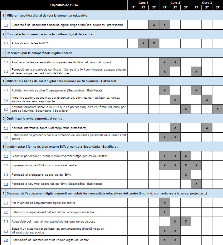 En aquesta fase, s’han definit els objectius a assolir amb la implementació de l’estratègia digital de centre educatiu. Hem definit de forma clara i concisa què es vol aconseguir tenint en compte els beneficis esperats. Els objectius definits són realistes, mesurables i amb un horitzó temporal clar, i estan orientats a millorar l’experiència educativa dels nostres alumnes i docents a través de l’ús de les TIC. Amb aquests objectius, esperem aconseguir una educació més innovadora, inclusiva i adaptada als reptes del segle XXI.